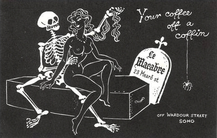 A notable coffee bar in Soho during this era was Le Macabre Club, an obvious predecessor to The Batcave in theme and décor. Opening in 1957 and closing sometime in the 1970s, Le Macabre Club took influence from the notorious horror-themed Théâtre du Grand-Guignol (The Grand Guignol Theatre) in Paris as well as other ‘death cafés’ in Europe. An excerpt from an article in The Telegraph (2017) describes Le Macabre Club’s atmosphere: “The tar-coloured walls would be adorned with plastic skeletons, painted cobwebs, and frescoes of naked women twirled in the moonlight by libidinous ghouls. You’d see hip teenagers (‘cats’, as they were known) wearing sunglasses, sipping espresso, and debating the ideas of Jean-Paul Sartre and the jazz of Dizzy Gillespie on the coffins, punctuated by the odd guitar jam…” [19] In an interview with The Look in 2000, Glen Matlock of The Sex Pistols described his experience at the famed Soho coffee bar, saying “When I started working as the Saturday boy at Let It Rock [in 1973], Malcolm McLaren used to take me around these strange places which played a part in early rock & roll. One time we went to Le Macabre. I don’t know how he knew about it, but it was the real thing. The tables were coffin lids and the jukebox only had songs to do with death.”